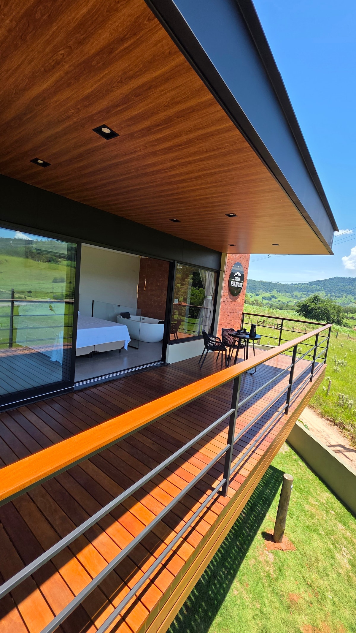 Aqui o despertador é o canto dos pássaros, a luz do amanhecer invade a suíte pela janela panorâmica e a serra do Itaqueri aparece diante de você como um quadro vivo, mudando de cor ao longo do dia. A Cabana foi pensada para casais que querem sair da rotina sem abrir mão do conforto. Durante o dia, silêncio, natureza e vista aberta para respirar fundo. À noite, clima intimista: filme no telão, iluminação aconchegante e uma jacuzzi interna perfeita para relaxar.