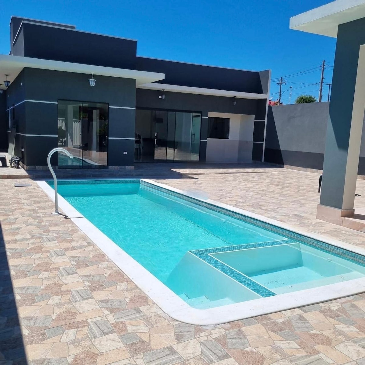 Casa recem construida c/ boa privacidade, local tranquilo, 600m do centro e do balneário, 50m da pista ecologica de caminhada, 6km do Thermas Water, estacionamento coberto com sombrite p/ 2 carros, piscina, cozinha americana com micro ondas, lancheira, coock top, smart TV, sofá, espaço com 2 redes, churrasqueira portátil à bafo, 2 suites c/ 1 cama queen + 1 de solteiro +ar cond. + smart TVs nas duas suites (You tube e Prime video dispinível), WIFI abrange toda a área. Não é permitido pet.