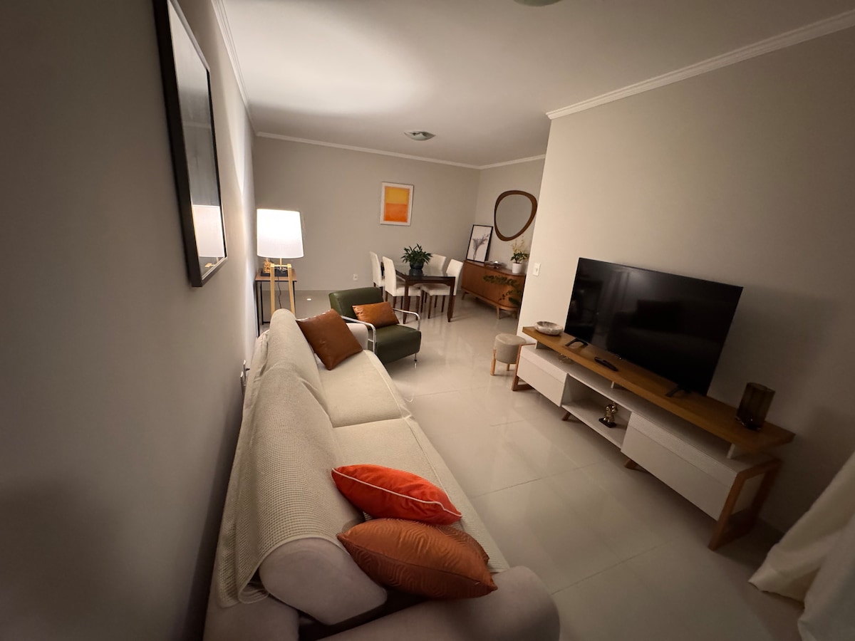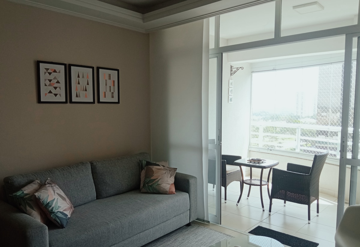Apartamento moderno de 82m², 2 dormitórios (1 suíte), totalmente mobiliado e com cozinha equipada. Varanda ampla, suite com sacada, móveis novos, cama confortável, Smart TV e Wi-Fi rápida. Espaço para home-office, aquecimento a gás e vaga de garagem. Localização excelente, em frente ao Shopping Colinas e com fácil acesso às vias da cidade. Ideal para até 4 pessoas. Conforto e praticidade em região nobre! Piscina, Sauna, Mercadinho, Portaria 24 horas, 2 Vagas cobertas.