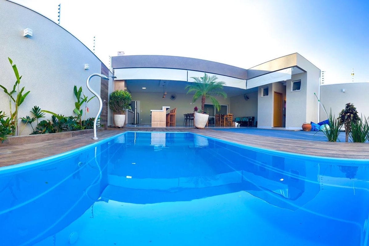 Possui piscina com aquecimento elétrico, com hidromassagem e cascata, área com churrasqueira, 3 quartos sendo 2 suítes independentes, todos com ar condicionado e ventiladores de teto, banheiro social, cozinha equipada, sala com Tv à cabo, Wi-fi e garagem para 03 veículos. Está muito bem localizada, próxima à padaria, açougue, pastelaria, hamburgueria e esfirraria; a 500 metros do supermercado e de 7 a 10 minutos dos parques, trajeto de fácil acesso.