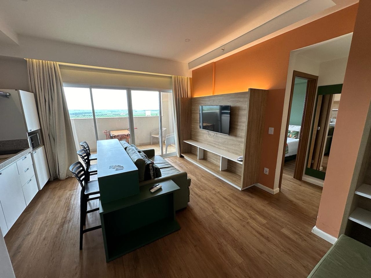 Aproveite este apartamento aconchegante com a sua família ao lado do Thermas dos Laranjais (apenas 3 minutos) e toda a infraestrutura de um Resort moderno e bem equipado. Apartamento com ar condicionado, microondas, frigobar e pia. Serviço de quarto com troca de roupa de cama e toalhas incluso. Atenção tomadas somente 220Volts.