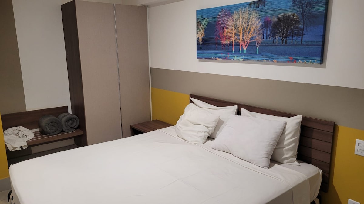 Espaçosa e moderna suite, na melhor localização de Olímpia, quarto, sala, banheiro, cozinha americana e varanda que acomodam até 6 pessoas. Fácil acesso a lojas, restaurantes, barzinho, mercado e ao agito da cidade.