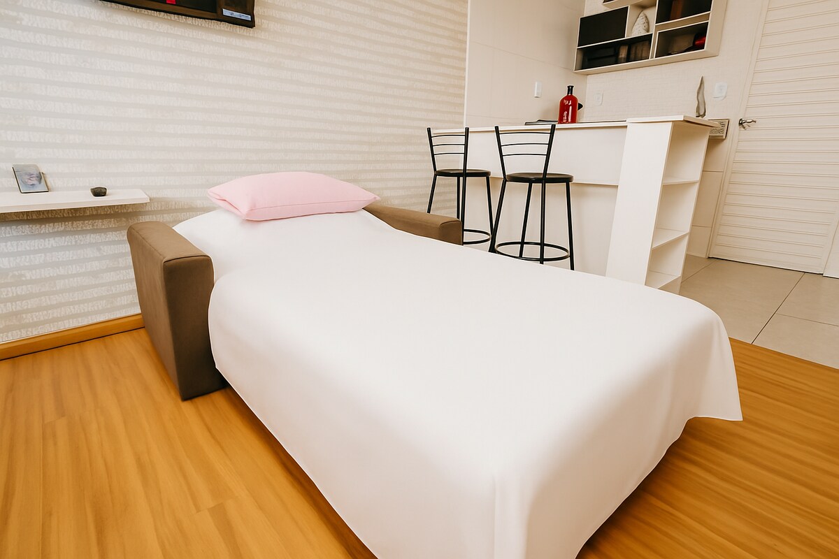 ⚠️ CONSULTE ANTES DE RESERVAR 🍽️ Não inclui refeições. ✨ Apto ao lado do Thermas dos Laranjais! 🏠 Sala com sofá-cama, cozinha americana (sem utensílios), quarto com cama de casal, cama de solteiro + auxiliar e mais 1 sofá-cama. 🚿 Banheiro c/ ducha a gás, secador e toalhas. 🌐 Wi-Fi, ❄️ ar-cond., 🚗 vaga coberta de acordo com a disponibilidade . Acomoda até 6 hóspedes (inclui crianças e bebês).