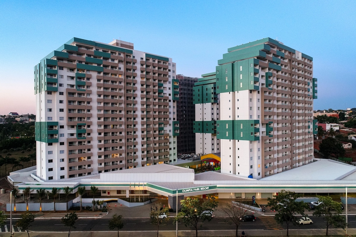 Flat ao lado do Thermas dos laranjais em Olímpia com cozinha Sala conceito aberto e cozinha americana dormitório com cama de casal, cama de solteiro, cama auxiliar e sofá cama na sala. excelente para toda família, serviço de hotelaria, piscinas aquecidas, piscinas climatizadas e piscina fria com bar molhado. saunas, parque aquático, sala de Jogos ,brinquedoteca, mini golf, quadra poliesportiva, atividades circenses quadra de beach tênis restaurantes, bares ,monitores, traslado para thermas