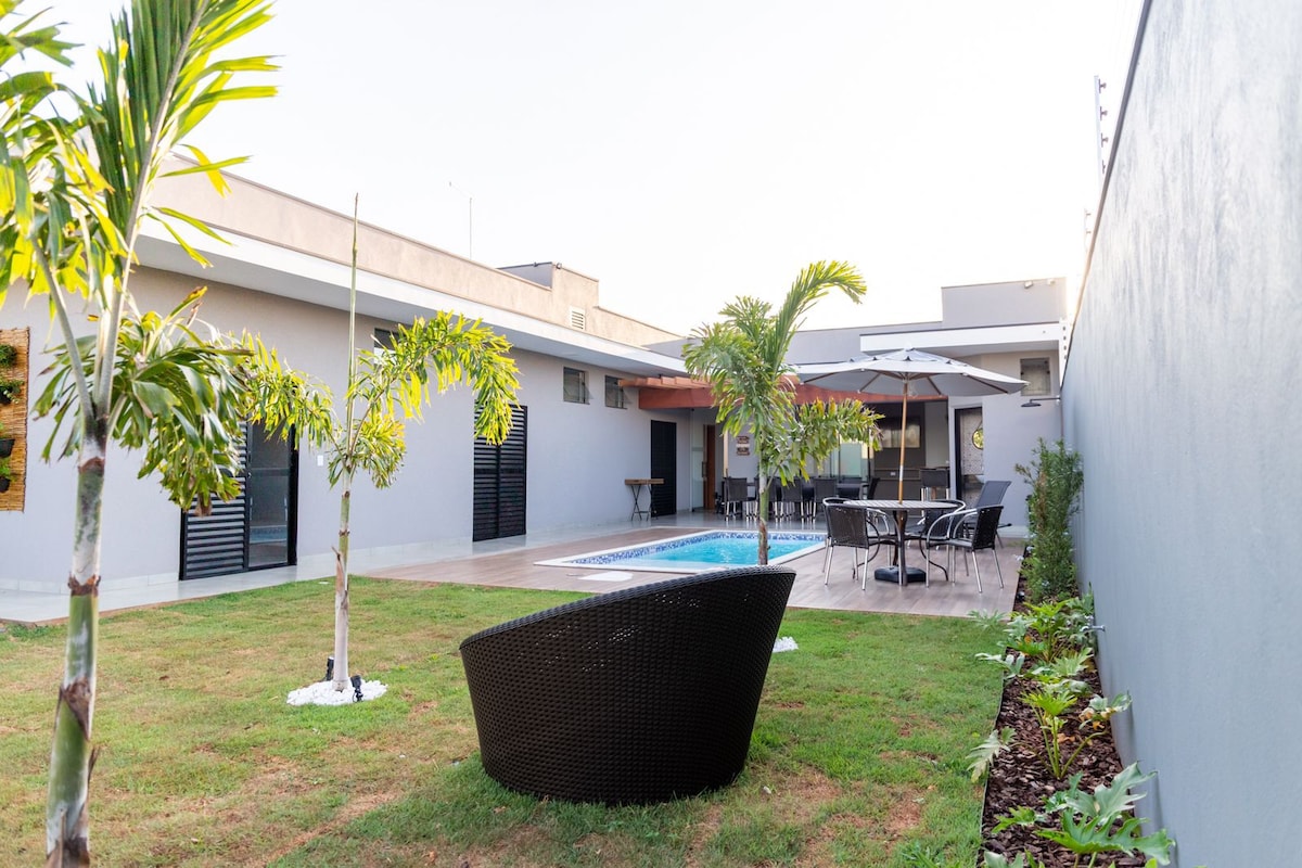 Possui piscina com aquecimento elétrico, com hidromassagem e cascata, área com churrasqueira, 3 quartos sendo 2 suítes independentes, todos com ar condicionado e ventiladores de teto, banheiro social, cozinha equipada, sala com Tv à cabo, Wi-fi e garagem para 03 veículos. Está muito bem localizada, próxima à padaria, açougue, pastelaria, hamburgueria e esfirraria; a 500 metros do supermercado e de 7 a 10 minutos dos parques, trajeto de fácil acesso.