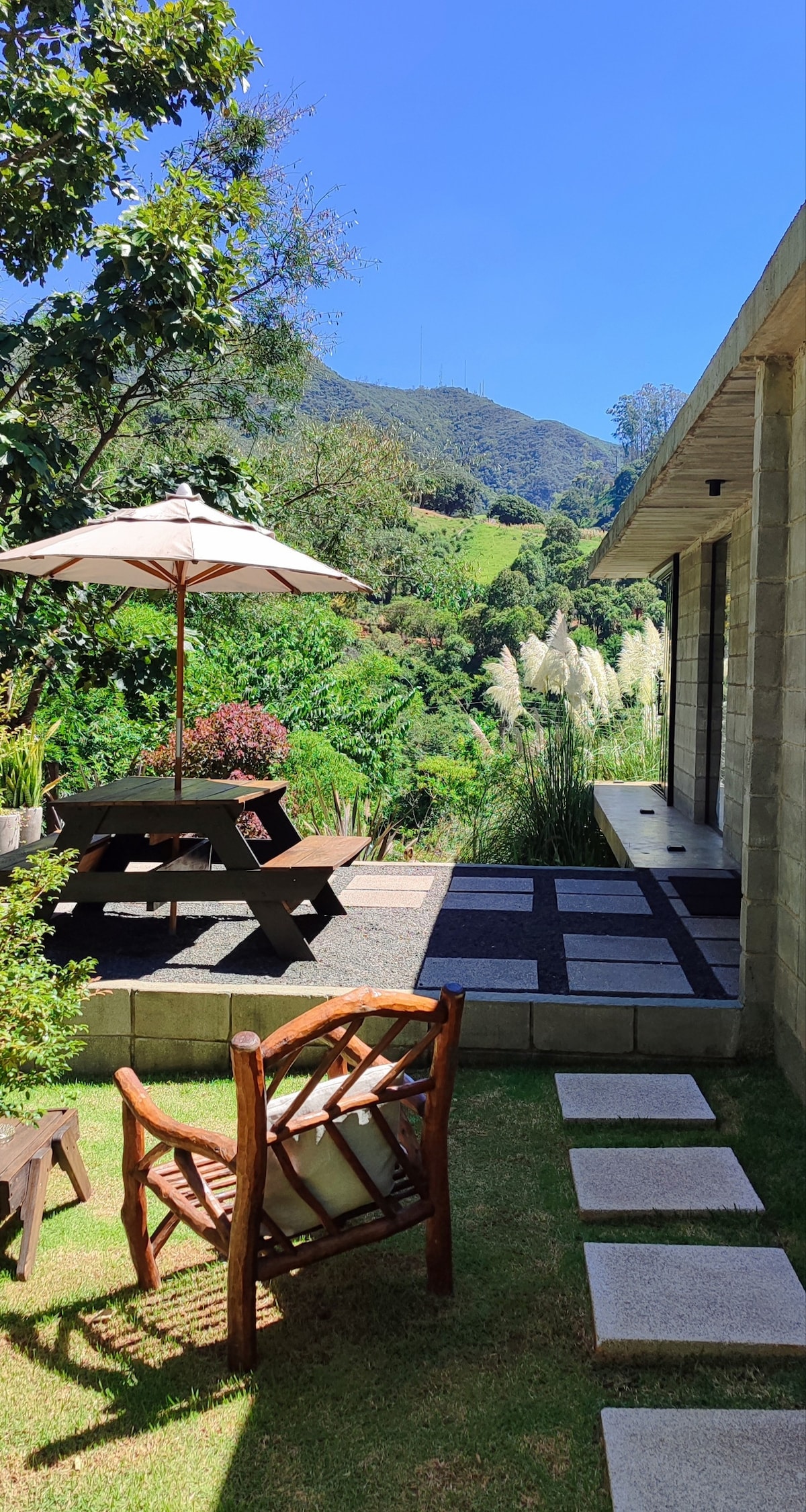 Refúgio romântico em meio à natureza, ideal para casais. Chalé estilo suíço (A-frame) em sítio cercado por cafezais, com rio e cachoeira particulares. Possui banheiras externas com vista para a Serra da Mantiqueira, jacuzzi interna, fogueira, churrasqueira, quadra de beach tênis, cama-balanço, sauna seca com vista e projetor interno com telão de 100”.