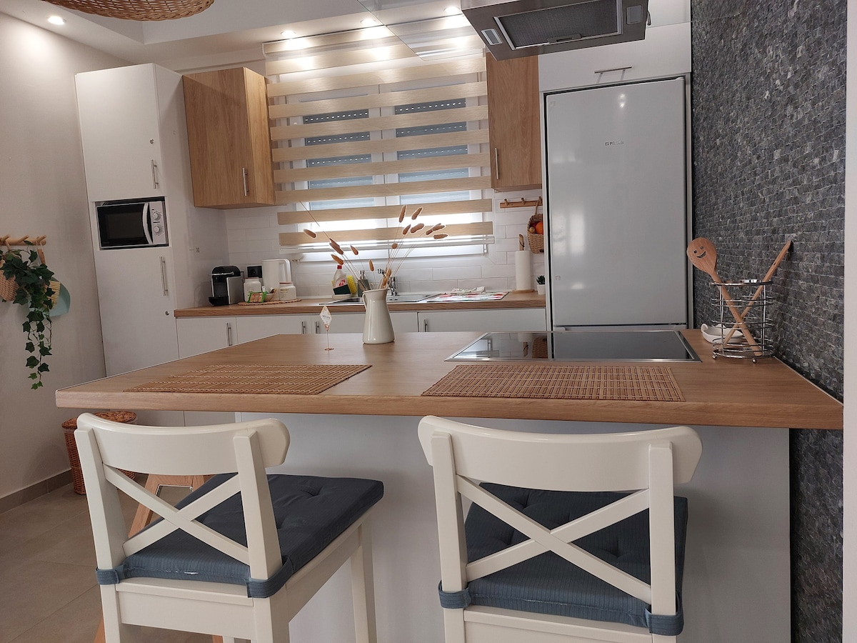 A beautiful, spacy, light rooftop apartment with views of the sea and mountain. 3 minutes from a blue star beach and a 5 star hotel. It has descent furniture, tableware, fast WIFI, TV channels from all over the world, HIFI system, air-conditioning, gas heathing, private parking, three balconies, elevator, intercom and a big walk-in closet. Close to Gerovassiliou (wine house), airport (15min), boat to the city centre in summer (45min). For a small fee we can pick you up from the airport.