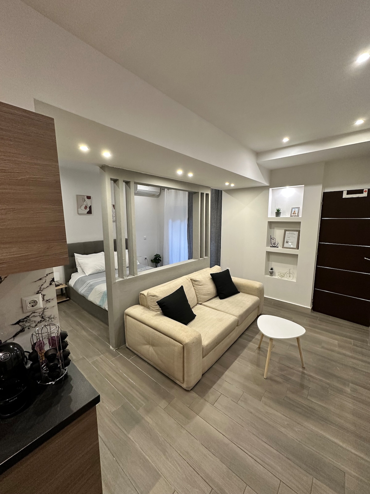 This is a unique project in a 20sqm apartment. Designed for a short term rentals, this place offers to the guests an experience and not just a place to stay. In the center of Thessaloniki, next to the White Tower. Suitable for couples, equipped with a queen size bed, jacuzzi, rain shower, smart TV, nespresso machine and washing machine/dryer.
