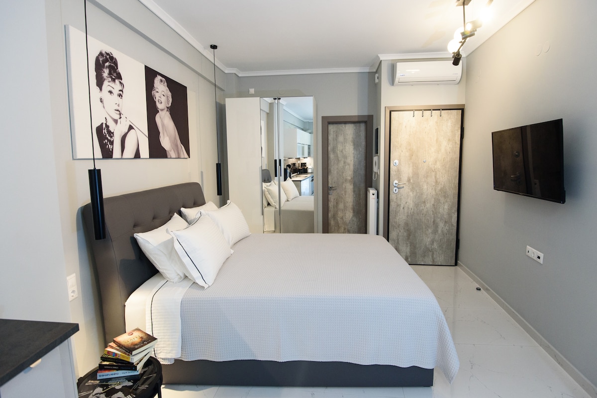 Unique 1 Bedroom fully equipped apartment on the seventh floor of a 2020 renovated building with a breathtaking terrace balcony. High speed internet, premium amenities, a luxurious queen size bed, and your very own Netflix account are but a few things we offer you. Luminous, spacious, with everything you might require to enjoy your stay in the heart of Thessaloniki's social life, only 5 minutes away from Aristotelous square and 2 minutes from the seafront. Welcome and enjoy your stay!