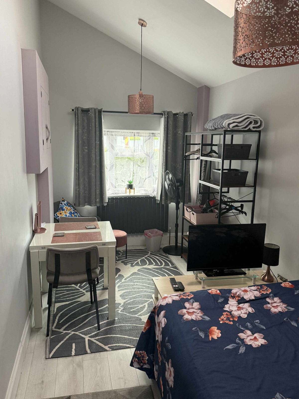 Brand new large studio apartment finished to a very high standard at the rear of our garden with a fully functional Kitchen,Bathroom and with a spacious bedroom / living space with a dedicated workspace and outdoor furniture. We are located in the lovely town of Loughton, walking distance to Epping Forrest and 30-35 minute drive to Stansted Airport and 1.5 Mile to Loughton Station. Free parking on the front drive, complimentary WI-FI, 65” Smart TV, Bluetooth Sound System Speakers.