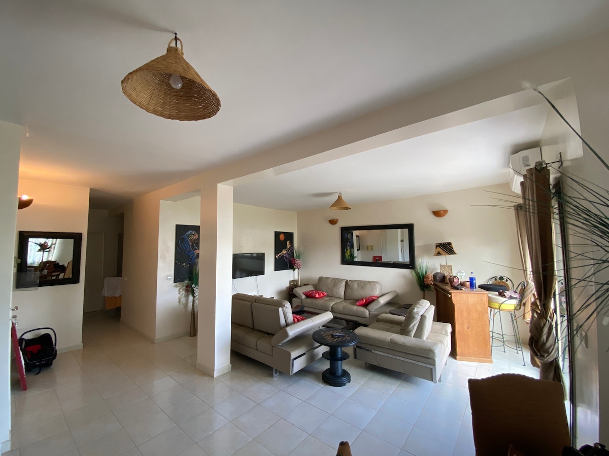 Escape to paradise with our brand new accommodation located in the charming town of Thiès! Our spacious and modern property features a cozy bedroom, a comfortable living room, and stunning balconies overlooking the lively street below. Stay connected with our complimentary high-speed wifi. We have rental cars. Located just a short distance from exciting attractions like the Accrobaobab adventure park, the Popenguine nature reserve, and the vibrant tourist town of Saly, our accom