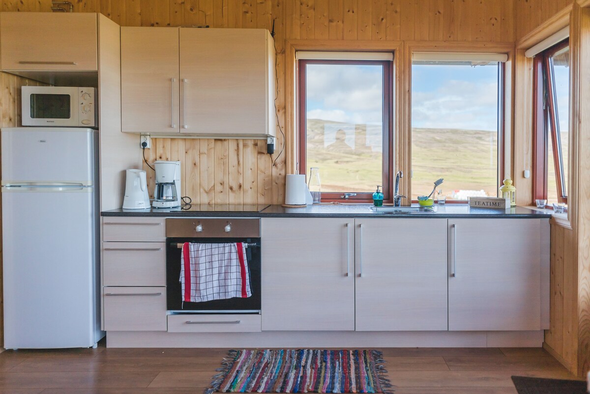 Perfect for couples! Private cabins (29fm3) by lake Apavatn. Great view of mountains as overlooking the lake. Queen bed (160cm), kitchenette with basic kitchen utilities, Nespresso machine, kettle, toaster, induction plate and a microwave. Veranda with seating area and a gas barbecue. Smart flat screen TV with Netflix. Everything is private, nature all around and space for exploring and hiking.