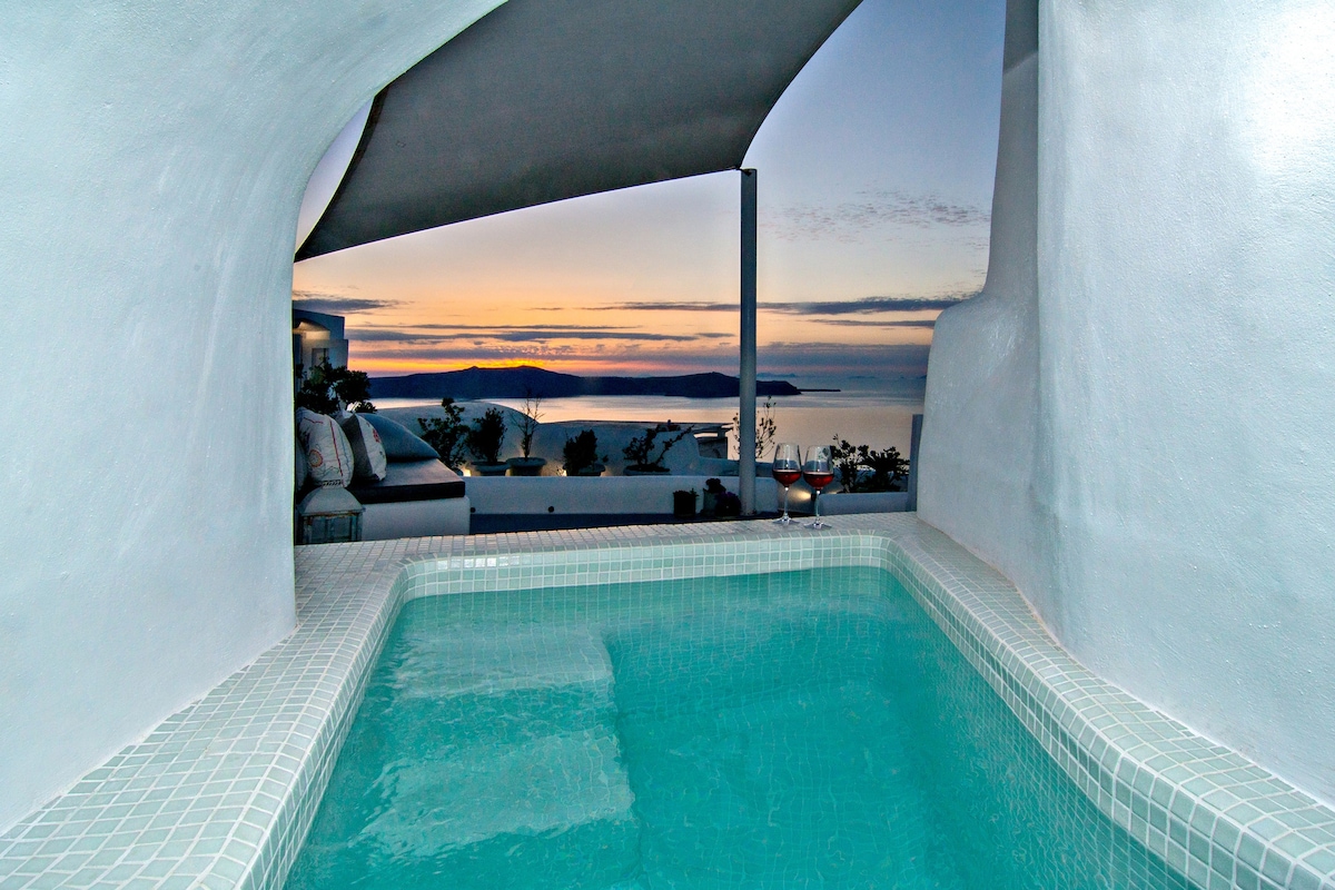 Anemos suite is located in Akrotiri overlooking the caldera and the volcanic islands . It is a suite with Private, Infinity heated Cave style plunge pool with Jet system and private patio. There is a king size bed that can accommodate two person. Daily breakfast is included and served in your suite . There is a cleaning service included. Inform us about your arrival details in advance , we can arrange a taxi/transfer for you.