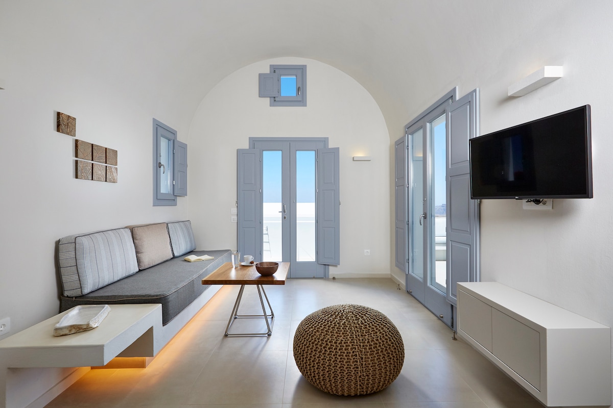 Mirabo Villa’s homonymous suite built in maisonette style has two different leveled bedrooms with double beds making it ideal for families, group of friends and honeymooners who want to enjoy their holidays in a very comfortable and relaxing way. The two separate and spacious bathrooms are beautifully styled and the living room offers hours of relaxation . On the second floor, you can enjoy the caldera & volcano views and the sunset from the private balcony.