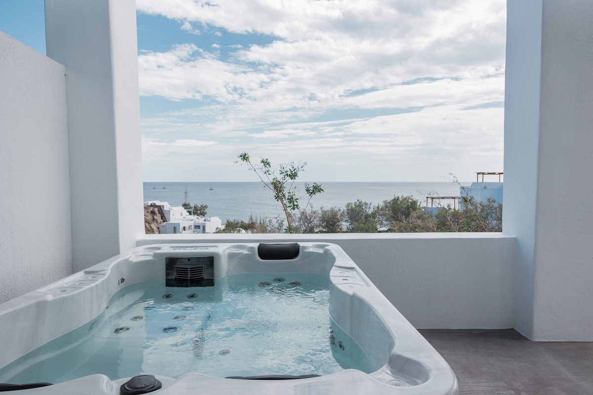 NO JACUZZI FROM NOVEMBER TO MARCH Auntie's Villas are located in Vourvoulos, one of the smallest villages in Santorini, just 10 km from Oia town and 3 km from the island's capital, Fira. This newly constructed villa has everything you need to make your vacations unforgettable. What makes this Villa unique, are the hot tub in the terrace combined with it's stunning sea views to the east side of the island and Cycladic architecture, along with a modern style decoration.