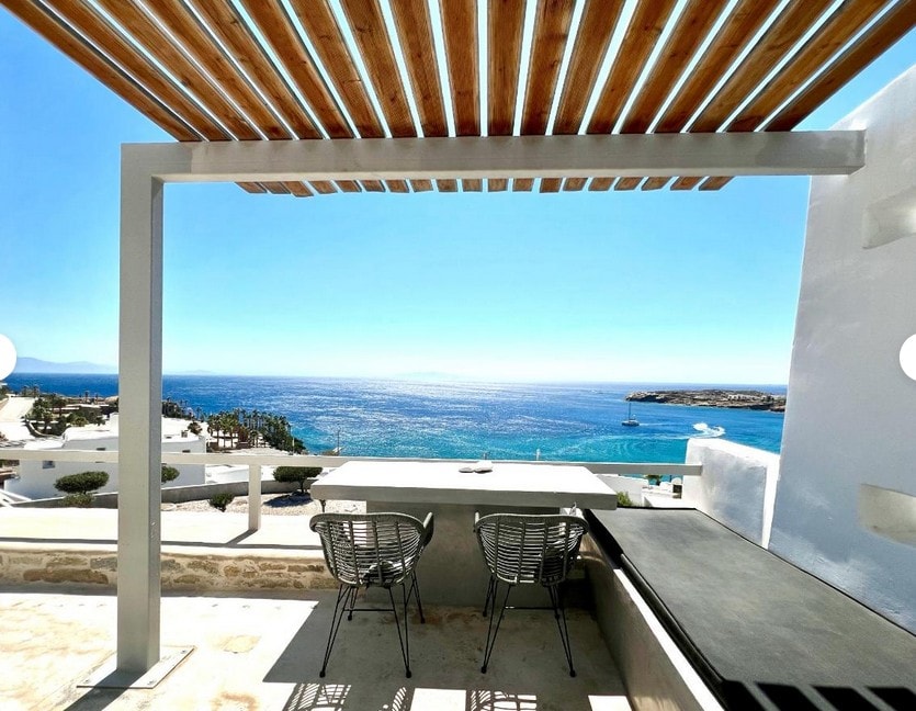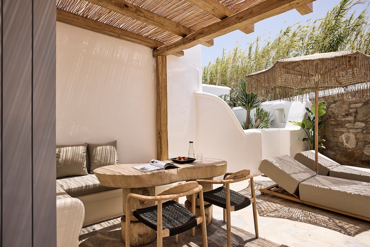The Classic Suite is a home that can truly exceed your expectations. A modern house with Mykonian architecture and fully equipped for an unforgettable vacation. Our complex is about 2 km from the city center and Super Paradise beach, which is one of the most famous and beautiful beaches on the island. There is always someone available to help you and arrange whatever you may need. There is also a shared area with a swimming pool, pool bar, and free gym.