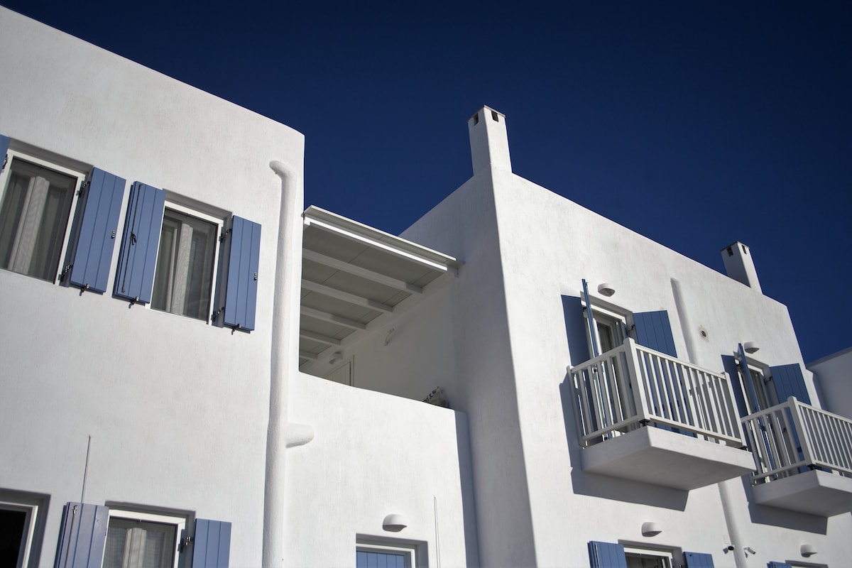 The Classic Suite is a home that can truly exceed your expectations. A modern house with Mykonian architecture and fully equipped for an unforgettable vacation. Our complex is about 2 km from the city center and Super Paradise beach, which is one of the most famous and beautiful beaches on the island. There is always someone available to help you and arrange whatever you may need. There is also a shared area with a swimming pool, pool bar, and free gym.