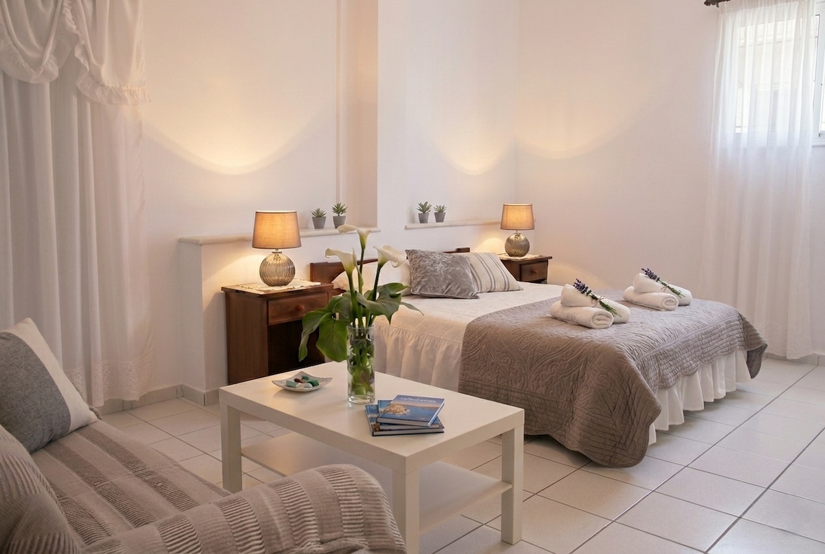 An apartment inspired by the colors of Psili Ammos beach of Naxos, known as well as Ηrisi Ammos, a beautiful sandy beach with crystal clear waters. It has two single beds, a spacious closet, a fully equipped kitchen with refrigerator, dining area, a living room with a sofa bed, a 32-inch flat-screen TV and air conditioning. It also features a balcony that combines sea and mountain view.