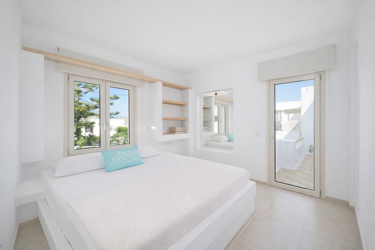 Our stunning Seaview apartment at the port of Naousa is a newly renovated two-bedroom flat located by the sea, overlooking the marina and Gulf of Naousa only a few meters away from the sandy beach of Piperi. A breath away from all the action, nightlife, shops, cafes, and restaurants the apartment is ideal for couples or small families looking for a comfortable stay while at the same time wanting to feel the vibes of the cosmopolitan center of Naousa while enjoying some breathtaking views!