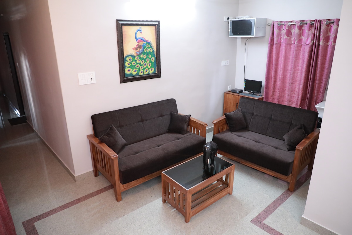 Our Home Stay is 7 bedroom Luxurious, eco-friendly Appartment/home set in a village location. It promotes peaceful setting, relaxation, privacy and memorable holidays to the guests. The Deluxe room apartment/home mentioned here is on ground floor and has 3 bedrooms with attached bathrooms, kitchen, Dining area Drawing space. My space will attracts you with the pleasant atmosphere, specious rooms, comfy bed and amenities.