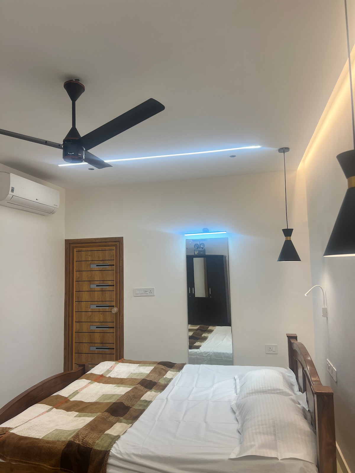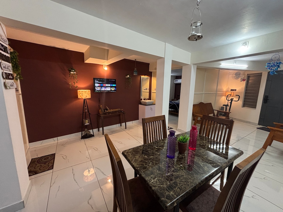 We welcome you to Laus Deo! Embrace the tranquility high above the city and make your stay truly memorable in our fully furnished, couple-friendly corner flat on the 9th top floor. room 1: one king size bed with AC bedroom. room 2: one sofa bed with AC bedroom Extra beds on demand. Amenities: TV with high-speed WiFi,fridge,washing machine,kettle,geyser , kitchen equipped with basic cooking utensils and gas connection,wardrobes, RO water purifier and a dedicated parking space (open parking)