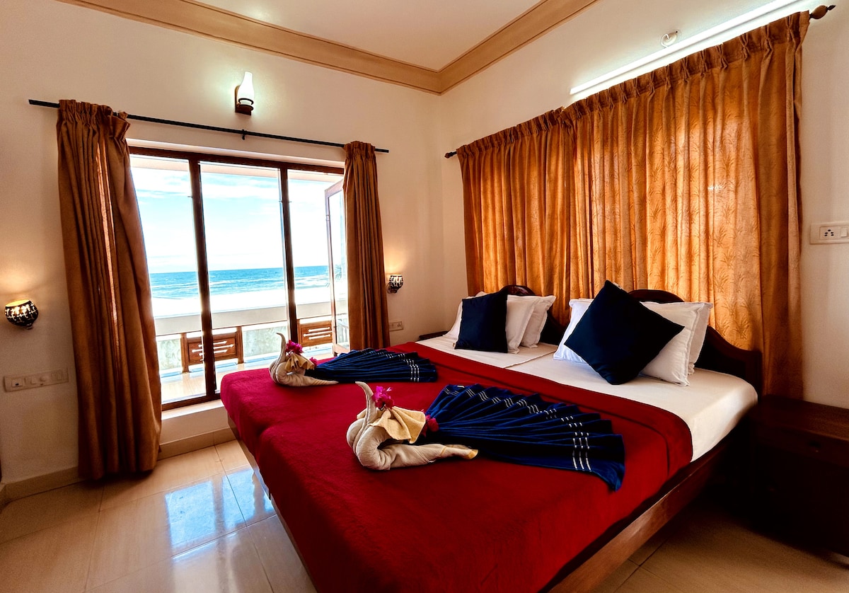 Escape to a peaceful oceanfront stay in our comfortable room with a private balcony and direct sea view. Wake up to the sound of waves, enjoy your morning coffee overlooking the ocean, and reach the beach in just a few steps. Ideal for guests seeking privacy, relaxation, and a true seaside experience at Kovalam Beach.