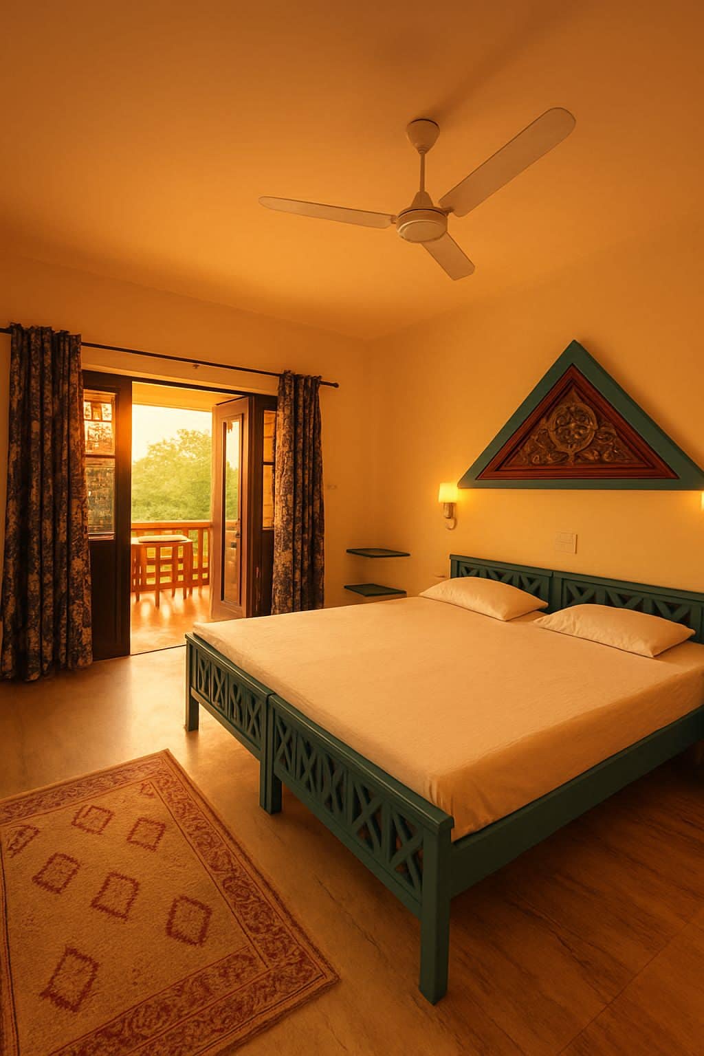 A serene villa nestled on the banks of Vellayani lake in Trivandum, surrounded by lush greenery and swaying coconut palms. The villa features traditional Kerala-style architecture with sloping roofs, wooden elements, and spacious verandas. Each room offers stunning views of the shimmering lake, reflecting the vibrant hues of the sunset. Guests simply relax in hammocks under the shade of trees. The atmosphere is calm and rejuvenating, perfect for unwinding in nature’s embrace.
