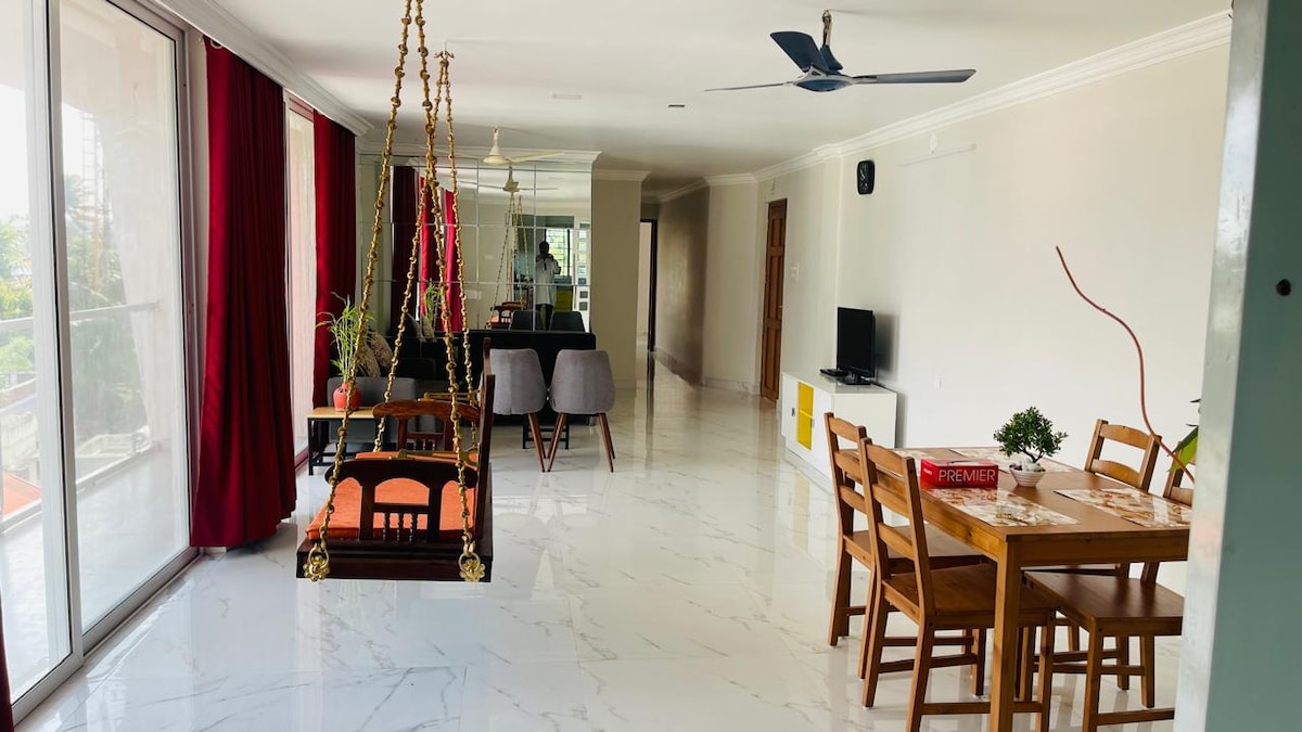 Have fun with the whole family at this stylish place. It’s a 3bhk spacious flat on 14th floor and awesome view . 3 rooms attached and all room and hall air conditioned . A large living room with 65 inch tv with OTT channels/DTH connected . The apartment has a fully functional kitchen with all cooking utensils provided. Easy access to green field stadium , technopark, Trivandrum ,airport, ,and beaches etc (Bachelors please message before booking)