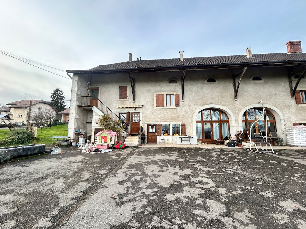 Rien que pour vous Chalet de 75 m2 au bord de la rivière dans un environnement calme entre Annecy et Genève et proche des lieux touristiques Vous profiterez en extérieur de 2 terrasses dont une abritée dans un parc de 5000 m2 un réel cocon de tranquillité au cœur de la nature pour un retour aux sources et une déconnexion le temps d'un séjour. Nos amis les animaux ne sont pas acceptés du fait de la proximité d'un haras et du passage des chevaux sur le chemin.
