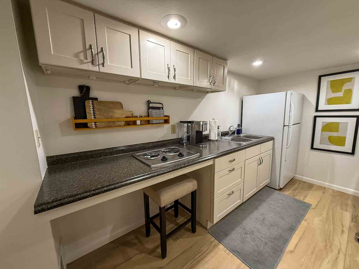 Tucked above a detached garage, this clean and cozy studio is perfect for solo travelers or couples. Enjoy a comfortable queen bed, fast Wi-Fi, Roku TV, full-size fridge, cooktop, microwave, Keurig, and central heat & air. Though compact, the space is thoughtfully designed for relaxation and convenience. Quiet, private, and ideal for short or extended stays. Off-street parking included. Stairs required to access the unit.