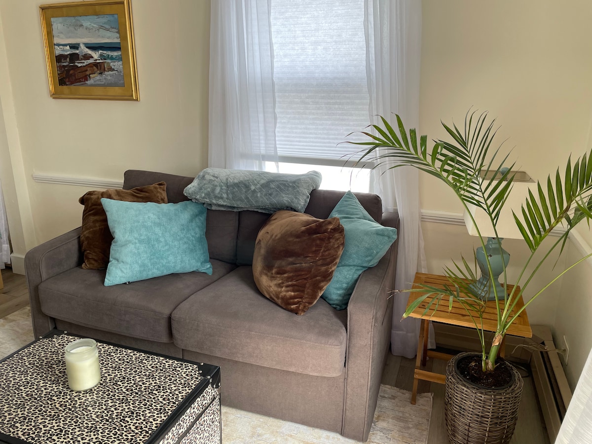 This is a spacious 1000 sq. ft. apartment in my childhood home that has been renovated in Spring 2020 with a modern coastal theme and well appointed with vintage items. We have a well stocked kitchen, cozy dining/living room with a 43" Roku TV, and full laundry. Try a pastry from the professional baker across the road, take a walk down the street to Crockett's Beach, or go for a stroll in downtown Rockland. Remote check-in available.
