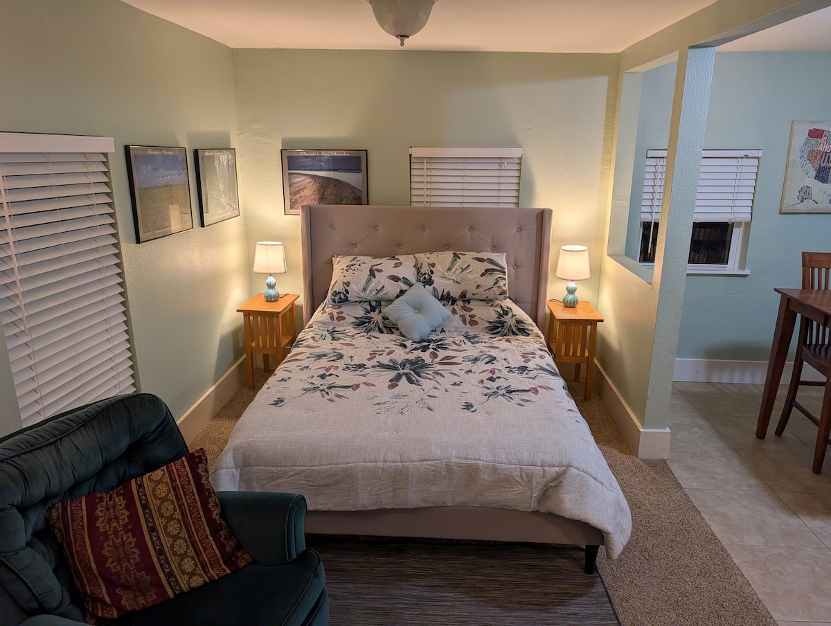Cozy~Quiet~Close~In Work-Space! FSU!/ Collegetown!, Midtown, Capital, FAMU. EnSuite, Kitchenette, Cottage-feel, New Memory-Foam Queen Panel Bed & Luxurious Oriental. Private Side Entrance. Private Bath & Pool Access. Shadey~Oaks, Lovely Flowers & Birds. Microwave, Huge Toasteroven, Stovetop, Barsink, Granite Counter, Minifridge, Singleserve Coffee Maker, Utensils. Safe~Quiet~Shady Sidewalk 'Walking Neighborhood'. Poolside Patio & Porch w/ Glass Table. We Love Our Dog! No Children Or Animals Plz