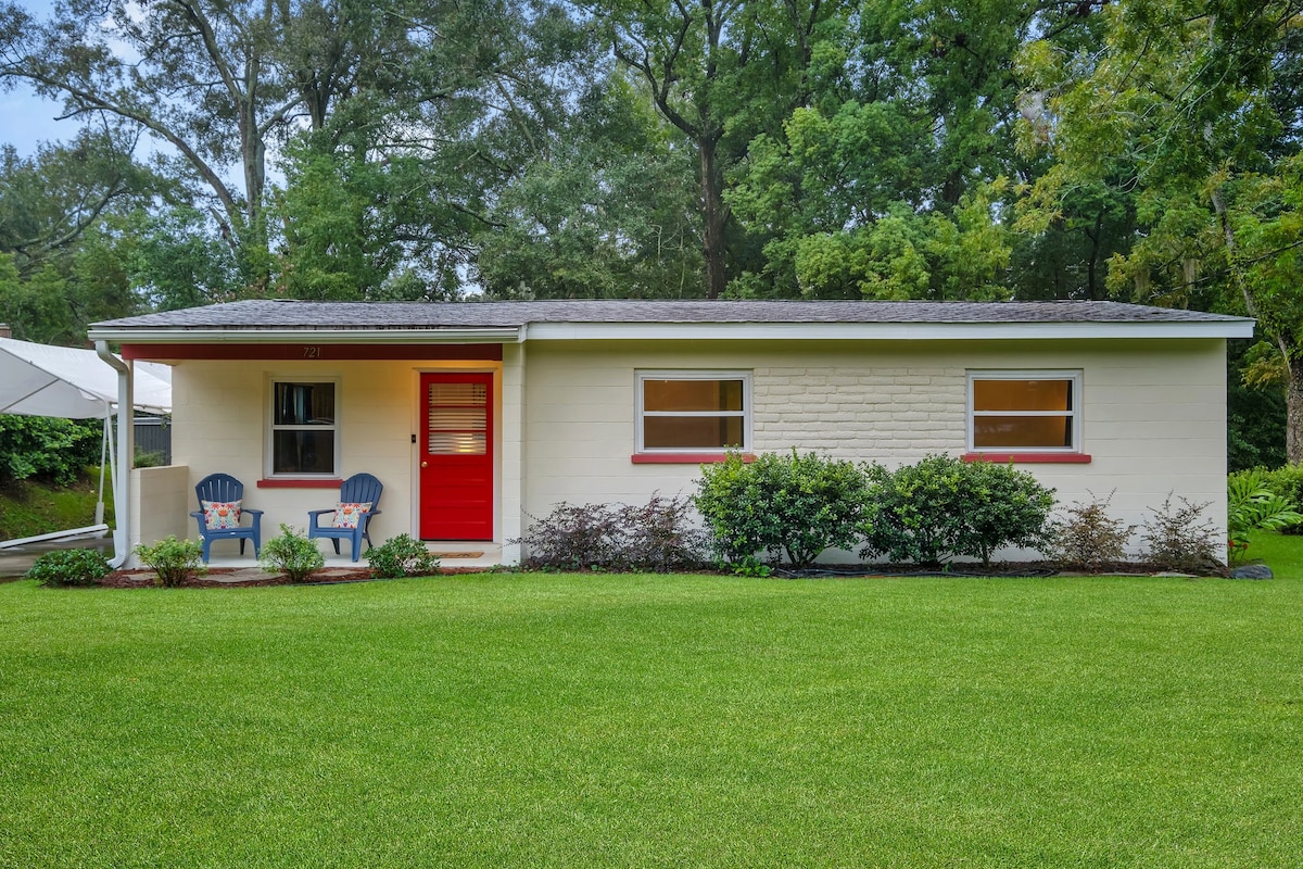 Welcome to your peaceful getaway, central to everything in Tallahassee! King bed ✔ Spacious, mural wall patio with a fenced back yard ✔ Private Parking ✔ Dogs Welcome ✔ Well-stocked kitchenette ✔ Mid-century charm ✔ Coffee, tea, snacks ✔ Cozy up with a movie in front of the custom wood slat wall, cook dinner in the kitchenette, and get a quiet night's rest under a stylish wood ceiling. You are: - 5 mins from TMH - 8 mins to downtown - 8 mins to FSU - 7 mins from I-10