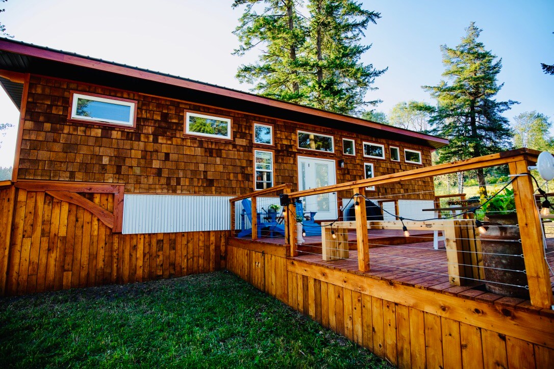 One of kind! Have your quiet cabin in the forest with all the cozy comforts you desire. Enjoy quiet sunsets on the deck with a fire after a hot Finnish sauna, then star gaze from under your duvet through the skylights. Enjoy a walk or snowshoe on 8 acres of private trails. This high-end professionally built tiny home has everything; make a memorable vacation, feel good about your eco-footprint. A wonderful experience of the forest while being 10 min to town and 5 min to Silver Star Rd.