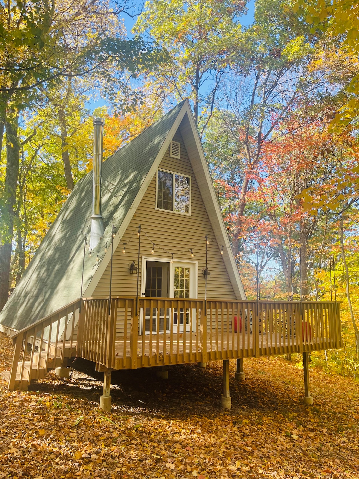 Unique "tree house" - an octagon tiny house, surrounded by the woods! 2 bedroom, 2 bathroom home you can enjoy the views of nature all around, with floor to ceiling windows. One king bed, one queen bed. Modern comforts with fun flash blacks. Private hot tub and firepit look into serene woods! Sit by the indoor gas fireplace and enjoy our record collection. Soak in a Japanese soaking tub. Enjoy fall colors or watch snow fall! Community indoor poor, seasonal outdoor pool, gym access