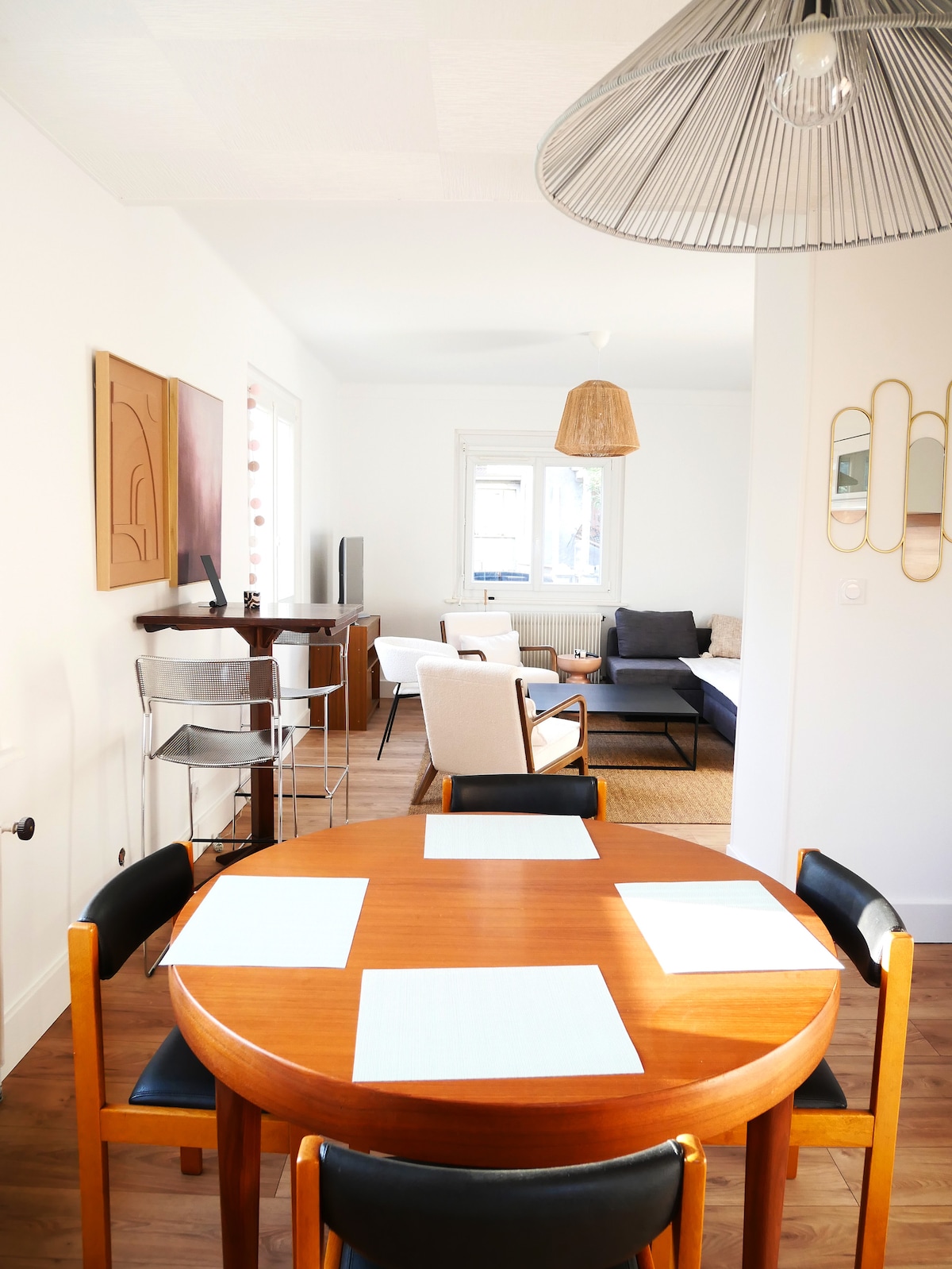 Notre maison est située à Annemasse dans un environnement calme proche de toutes commodités & des endroits touristiques L'appartement est entièrement rénové avec soin et agencé pour accueillir confortablement une famille jusqu'à six personnes 2 grandes chambres Cuisine est entièrement aménagée et équipée Le linge de bain et de lit est fourni Vous aurez accès au jardin avec jacuzzi Nous mettons à disposition un garage fermé pour vos vélos, et une place de parking dans la cour de la maison