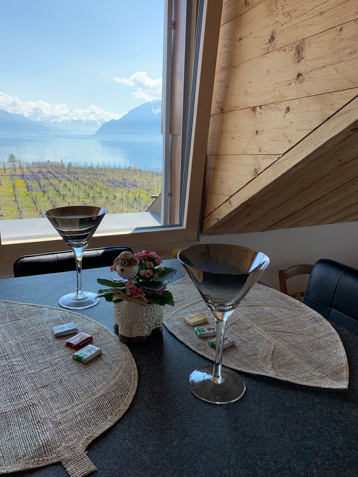 Un lieu privilégié avec vue 180 degrés sur les vignes, lac et montagne Appartement neuf, grande terrasse surplombant le lac, Beaucoup de cachet, vieux bois, pierres naturelles, douche italienne, sèche cheveux, cuisinette, avec évier, frigo, bouilloire, thé, café, micro-ondes, four, 1 plaque électrique, deux casseroles , assiettes etc... Coffre-fort, TV led etc... Mini bar, vins de la région ! Transports publics (train) gratuit de Lausanne à Montreux ! Parc privé et gratuit devant la maison!