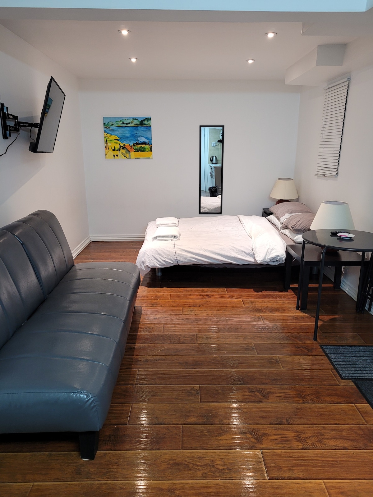 Relax in this newly renovated basement studio, complete with a fully stocked kitchen, 55-inch TV, high speed Wi-Fi and washer/dryer. Enjoy the convenience of on-site parking and easy access to nearby parks, public transit, downtown Toronto and amazing restaurants. Whether you're here for business or leisure, this cozy retreat offers the perfect blend of comfort and convenience for your stay. *** As central as it gets in the GTA; close to Person Airport, Hwy 401/404/407, and shopping malls!