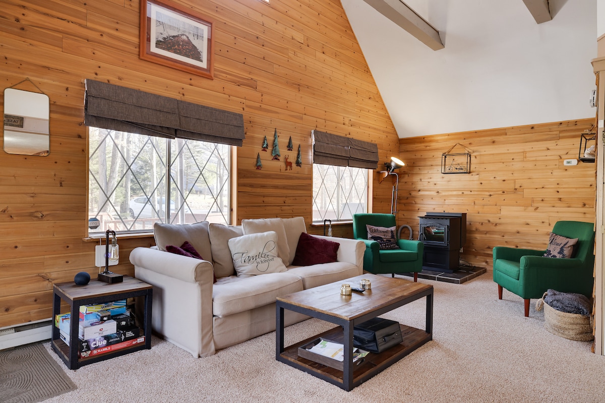 宽敞的度假木屋-步行2湖/滑雪山/火坑/热水浴缸/游戏