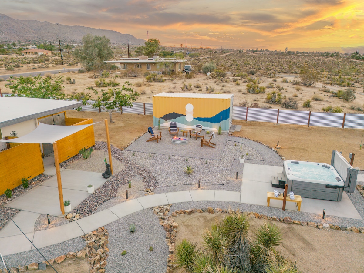 Welcome to the spacious, sun-filled oasis with 360-views of mountain+desert vistas. ->2000 sqft of living space - 10 mins from West entrance of JT national Park -5 minutes to JT Village shops+cafes. -Brand new construction -Tranquil, secluded retreat -Starlink 🛰 200mbps -Fully stocked chief's Kitchen -Coffee Bar and Cocktail supplies -Dedicated Yoga+Meditation room -Oversized Spa- heated year around -Tesla EV level 2 charger -Record Player We invite you to unplug and reset @CasaSerranoJTree.