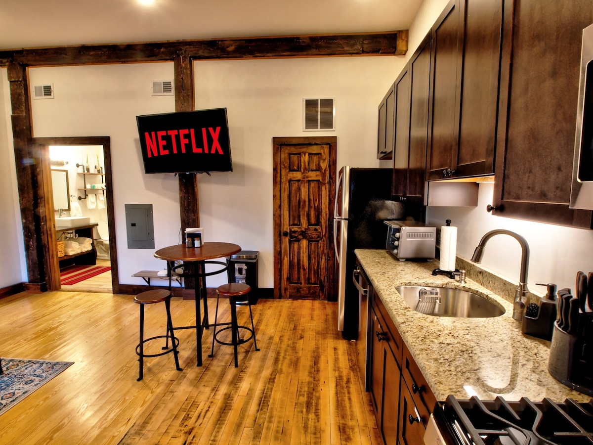 Walking distance to Wayne Memorial Hospital & Down Town Honesdale to Breweries, Restaurants, Shopping, Hiking & Biking. Built in 1900, The Irving Cliff Glass Building was recently converted into luxury apartments. Here's your chance to stay in a modern industrial unit with the following: King Size Bed Free wifi Smart TV's w/ Netflix and Disney Plus Coffee Station Including Decaf & Tea Fully Stocked Kitchen Leather Sofa With Pullout Bed Washer / Dryer in Unit Exterior Security Camera
