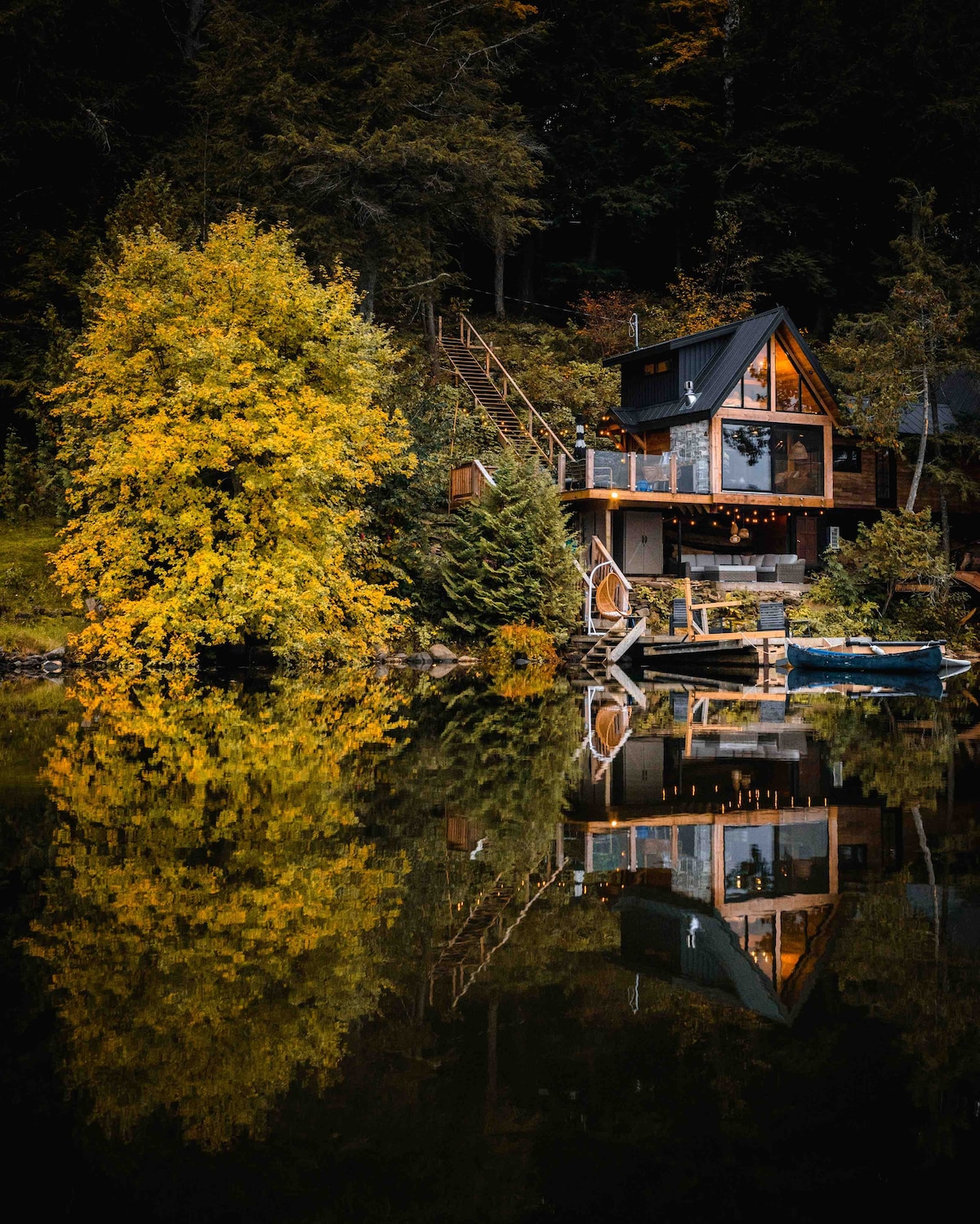 CottageCreators presents a once-in-a-lifetime (or as often as you’d like!) Muskoka escape. Perched among the treetops on one of the region’s most stunning lakes, this rustic-luxury retreat offers a floating hammock net, two-sided indoor/outdoor fireplace, and private dock for swimming, canoeing, kayaking and SUP. Fall asleep to the gentle sounds of the lake, wake up to sunrise through the trees, and unwind in total seclusion—just you, the forest, and the water.
