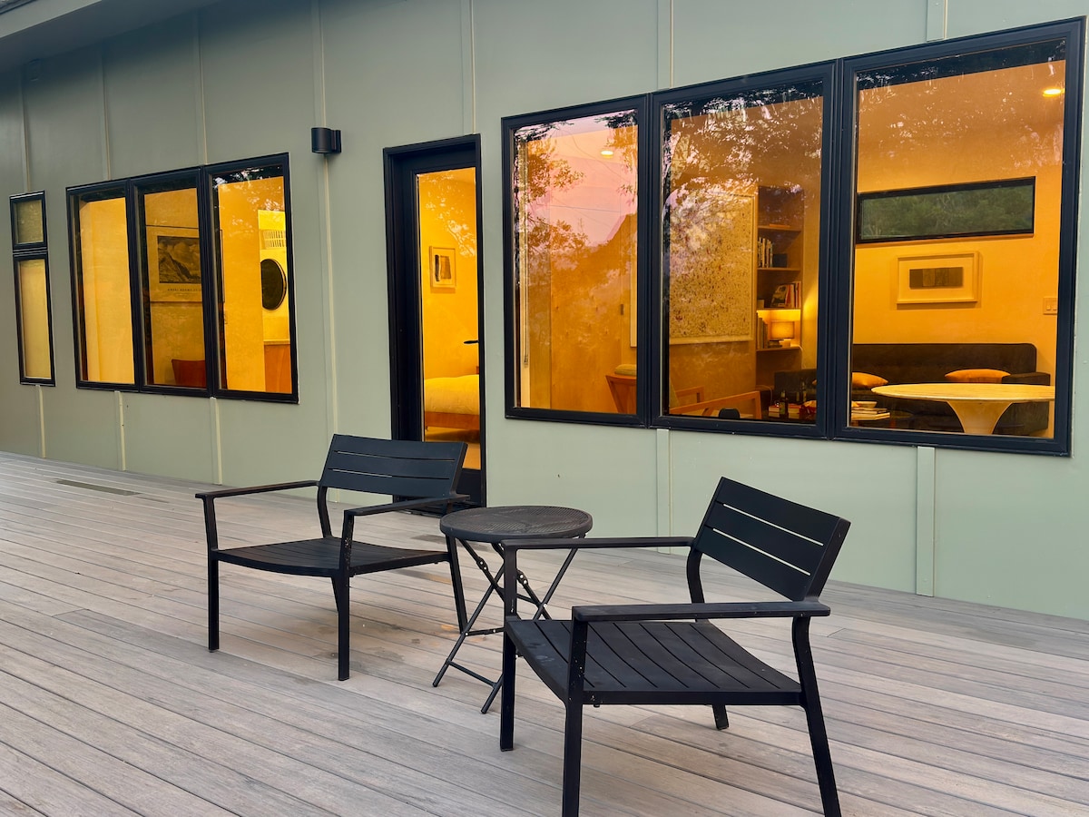 Modern mountain-view design studio in Three Rivers, just minutes from Sequoia National Park, featuring a private deck in a peaceful natural setting. This thoughtfully designed California-modern cabin offers scenic Sierra foothill views, abundant natural light, and a calm, private atmosphere—ideal for a quiet retreat near hiking trails, rivers, and the park entrance. The newly built studio includes a custom kitchenette with stone countertops, curated furnishings, and an art and book collection.