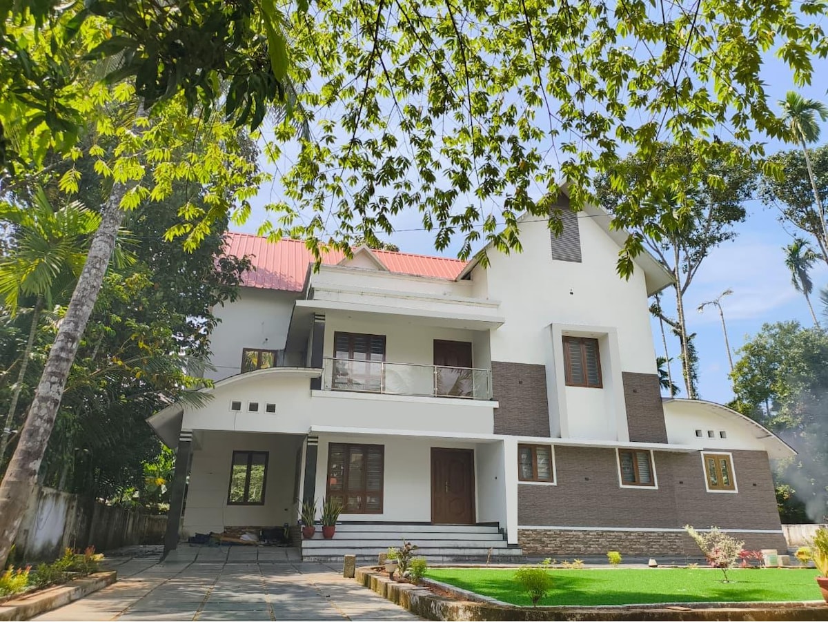 Private luxury villa near Guruvayur Temple, just 5 kms (10-minute drive) away, located in the peaceful village of Pavaratty near Thrissur, Kerala. Ideal for families, pilgrims, groups, and long stays, this spacious villa features a large landscaped garden, verandas, outdoor sit-outs, and modern interiors. Enjoy complimentary breakfast, complete privacy, calm surroundings, and easy access to Guruvayur-perfect for temple visits, celebrations, staycations, or work-from-home retreats.