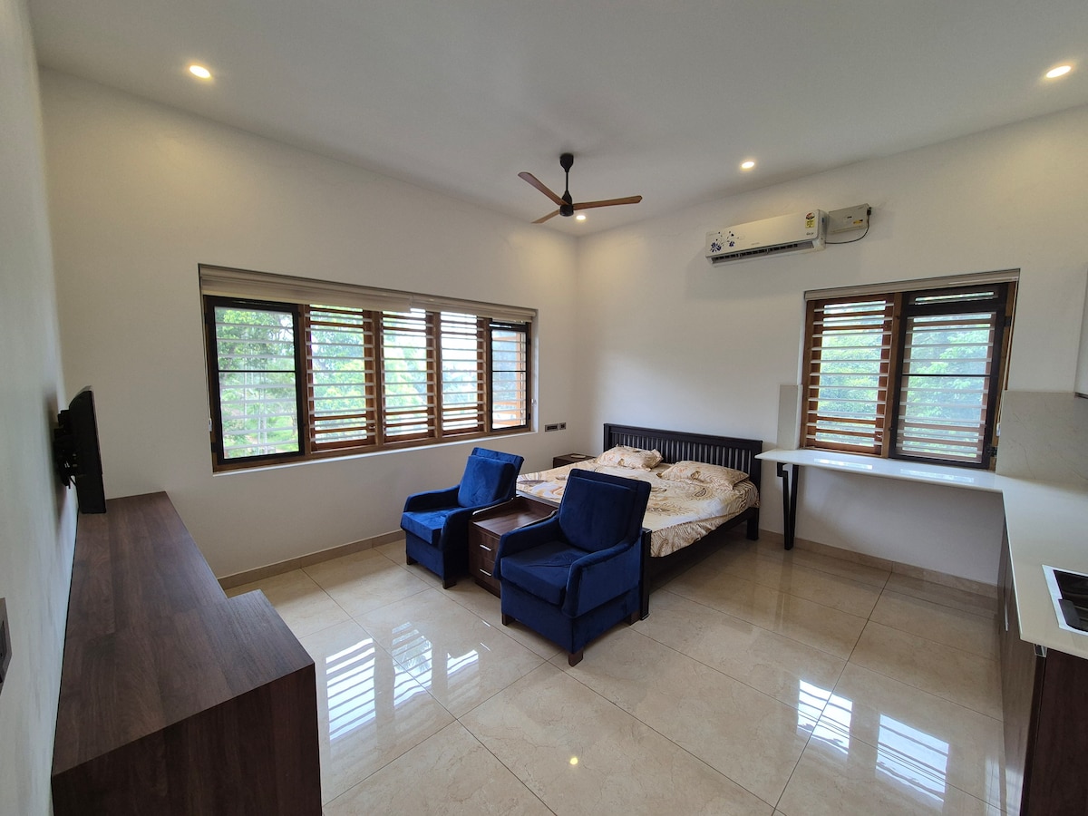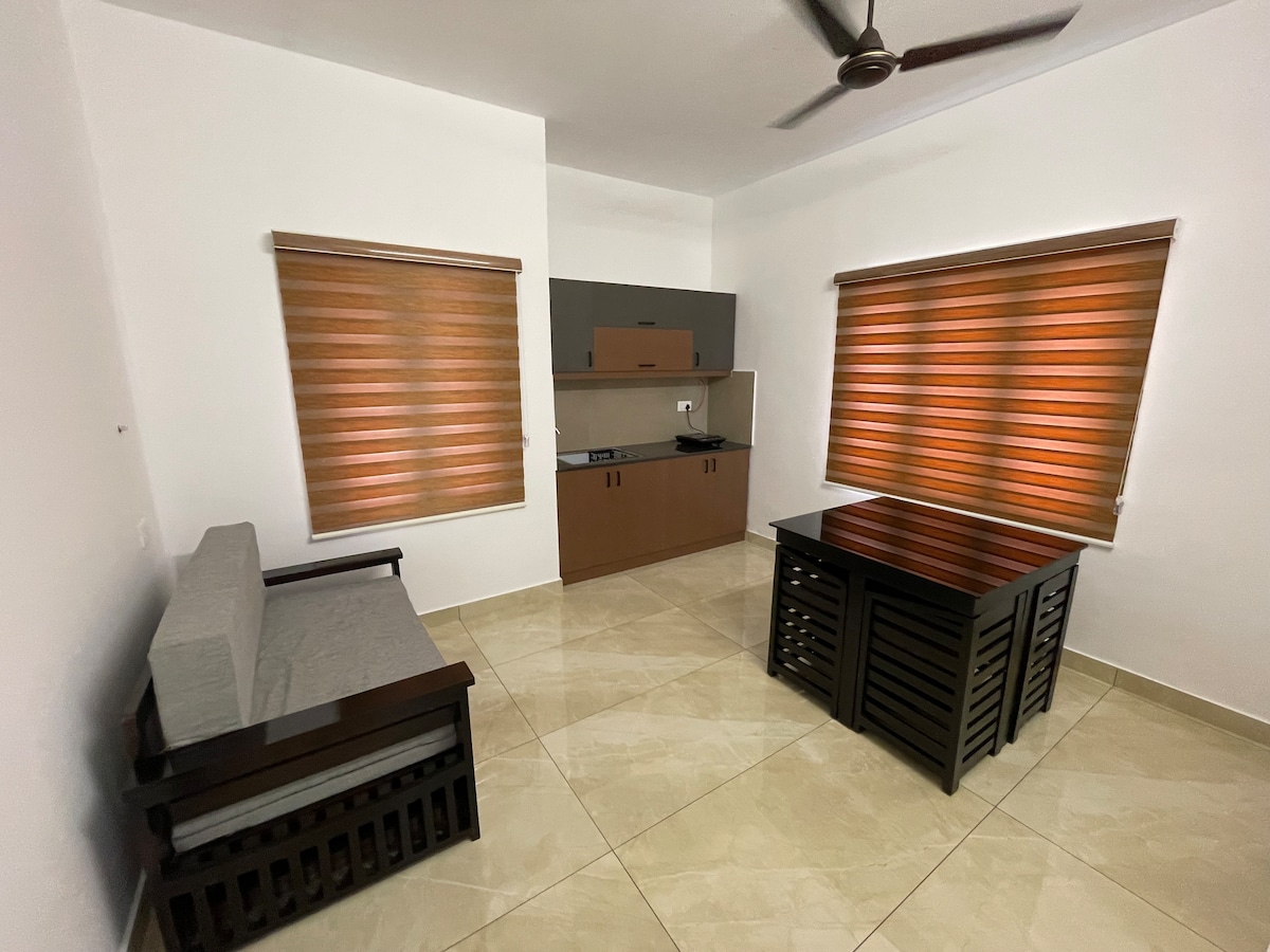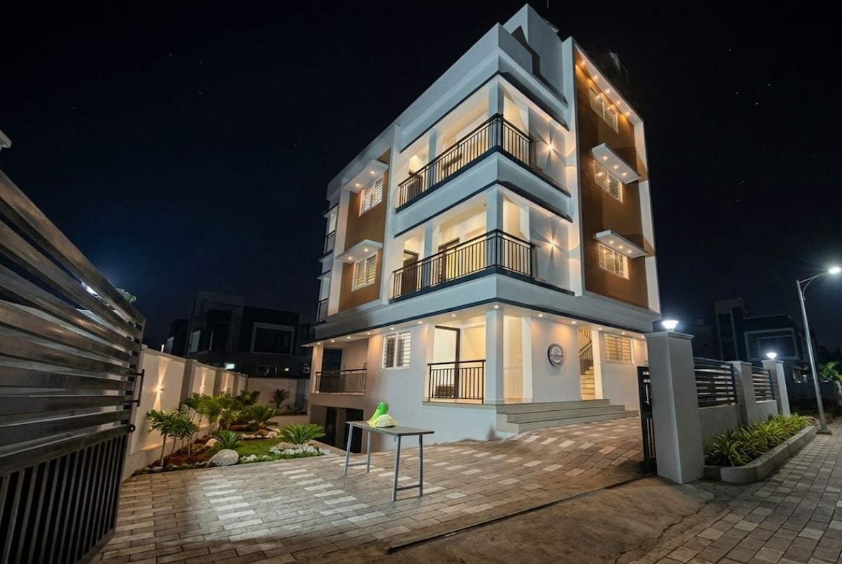 Enjoy the luxury stay in modern 1 BHK apartment featuring an AC bedroom with TV, and a cozy living area with TV, Fast WiFi, a dining space, a 3-seater sofa and a double cot, The kitchen includes a fridge, washing machine, Mixie, induction stove, kettle, and essential utensils. — Ideal for families and travelers looking for a clean, comfortable, and convenient stay. — Easy access to Restaurants, shops, and Railway station — A total of 4 adults and 2 children can be accommodated comfortable