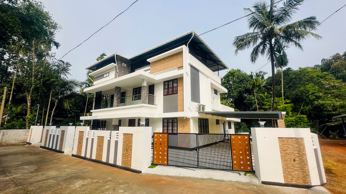 The house is located exactly opposite to KAMCO,Mala and a 40 minute drive from Cochin Airport . Set in a serene environment,its just 8 kms from kodungallur Bhagavathy temple. It is a mint fresh 2 story 2 bedroom property with all basic facilities like a fridge,cot with mattress in both the bedrooms,TV,washer and a couple of sofa sets.Geyser ensures hot water in bathrooms.The house is perfect for travellers looking for a quiet place away from the city bustle. Waterview from intermediate floor.