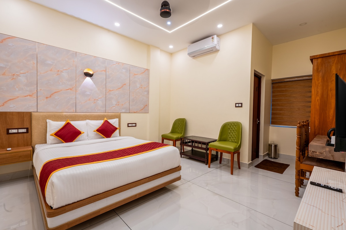 The Deluxe Room at Sreeja Myst offers a spacious and elegant stay with refined décor, a comfortable and upgraded amenities. Designed for added comfort, the room features complimentary Wi-Fi, premium linens, a modern bathroom, and a relaxing ambience—perfect for travellers seeking a blend of style, convenience, and value