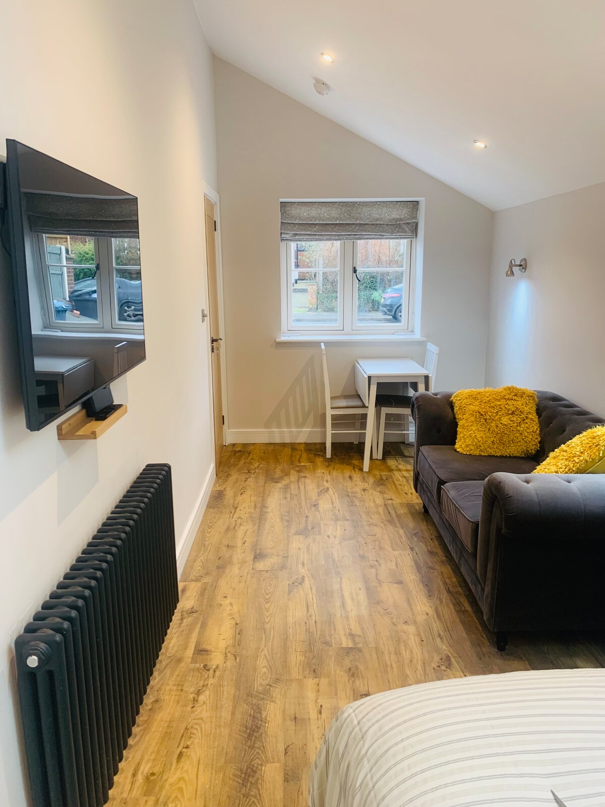 This studio flat is in the same building like our other listing. Totally separated from main house with a modern kitchenette, a comfy double bed, a bathroom with walk-in shower and underfloor heating. Ideal for an individual or for a couple to have a nice short stay. It has a smart TV, wi-fi, central heating, micro,fridge, toaster and kettle. Has not got oven, hob, freezer, washer and dishwasher. Unfortunately not suitable for babies or children to stay. There is a roundabout almost in front.