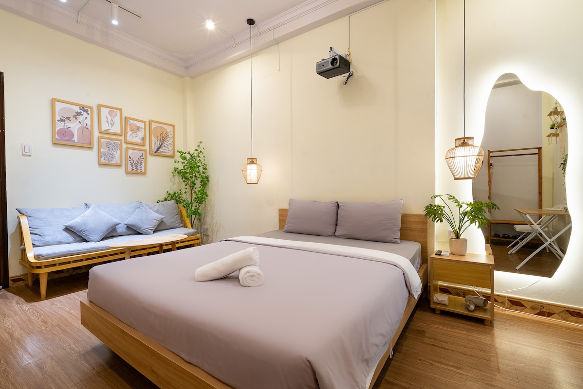 Escape to your stylish minimalist sanctuary in Central D1! This cozy hideaway features warm wood accents, natural light, and a modern bathtub perfect for unwinding. Cook memorable meals in the fully equipped kitchen with all essentials provided. Located on a peaceful alley yet steps from Saigon's top attractions, this authentic retreat offers the perfect blend of tranquility and urban convenience. Ideal for couples seeking a refined city experience with all modern comforts!