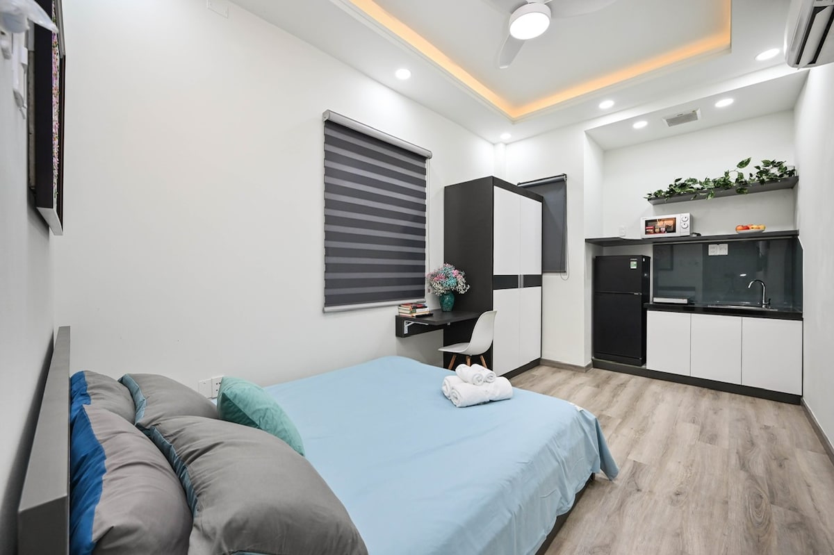Our bright and spacious space is located in District 1, the heart of HCMC. - Elevator is available - LOVELY STUDIO with FULLY-EQUIPPED KITCHEN and WINDOW - PRIVATE bathroom - Towels are included and changed everyday for free. - FREE wifi, cleaning everyday.